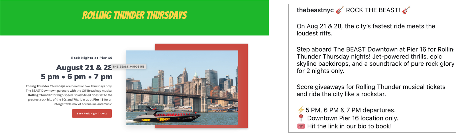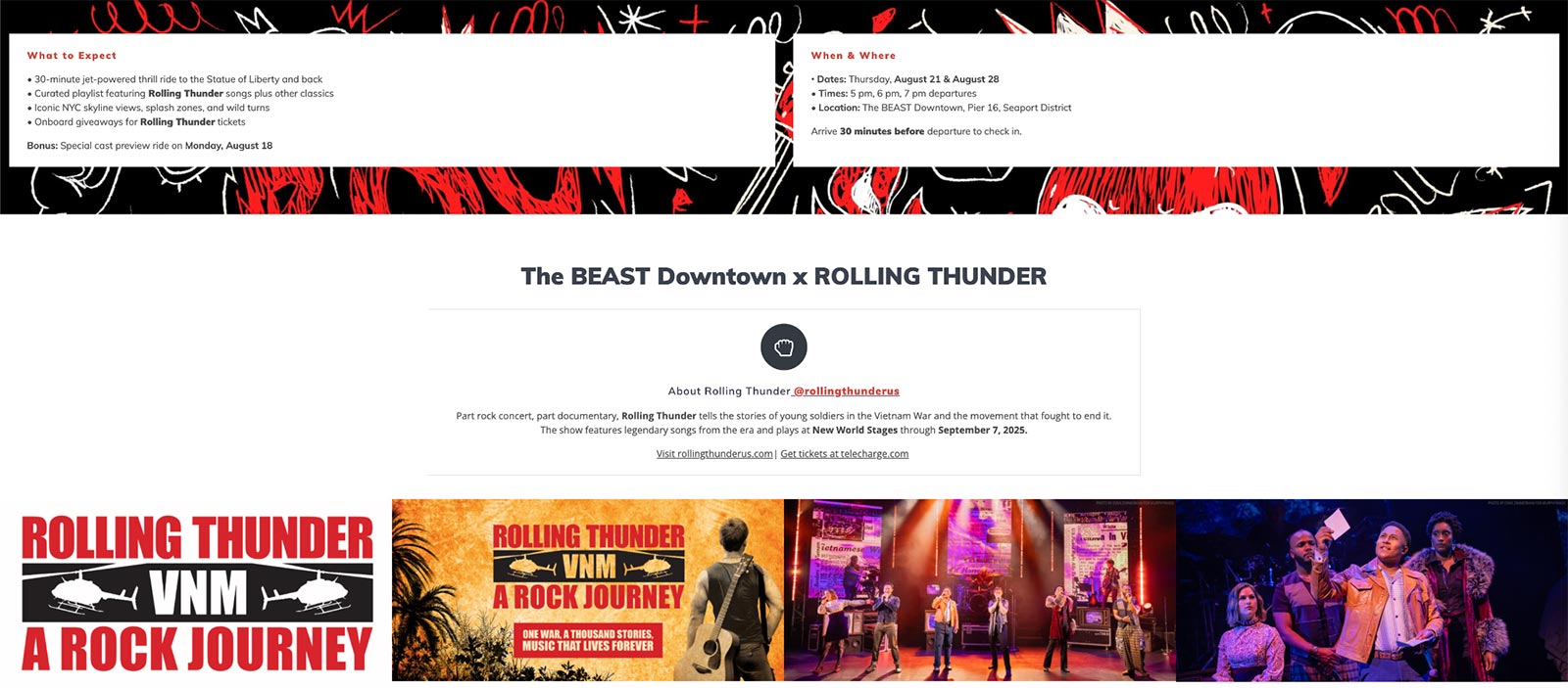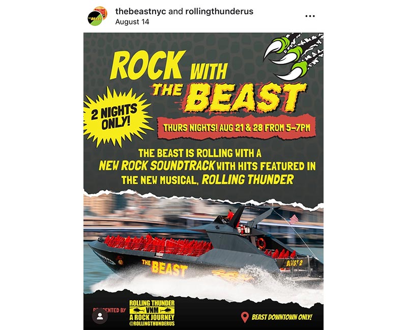 Off-Broadway’s Rolling Thunder musical teamed up with New York’s thrill ride The BEAST at its brand-new downtown location for Rolling Thunder Thursday themed rides throughout the month of August, featuring a playlist of the songs from Rolling Thunder on board the boat, show-themed trivia, and the chance to win tickets to the show. This was The BEAST’s first-ever partnership with a theatre show.